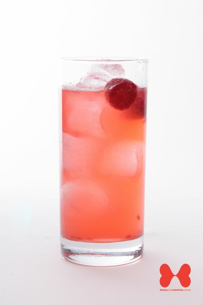 50 ml Gin, 25 ml Lemon Juice, 12 1/2 ml Sugar Syrup, Top-Up Soda Water, 12 Raspberries