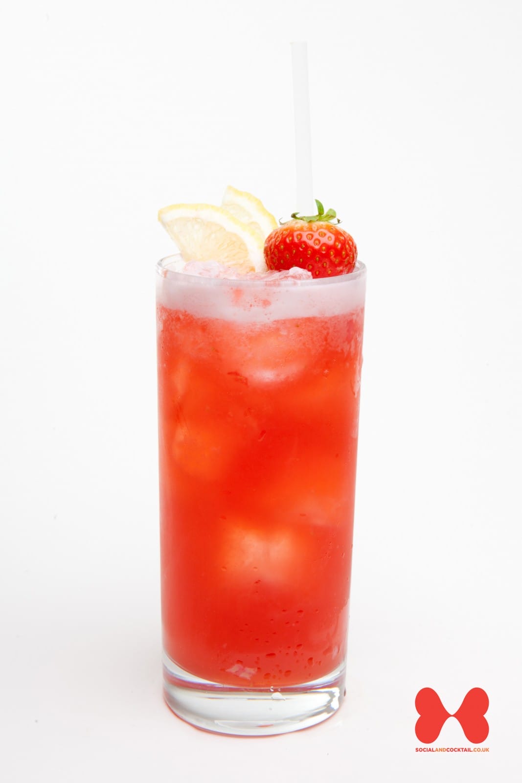 6 Strawberries,10 ml Elderflower Cordial, 10 ml Ginger Syrup, 10 ml fresh Lemon Juice, 60 ml Cranberry Juice, 60 ml pressed Apple Juice, Garnish – Lemon Slice & Strawberry