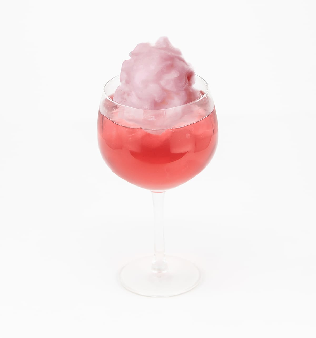 Add Rose Gin, Cranberry Juice and Sugar Syrup to a goblet glass. Add ice. Stir it all up. Top up with white lemonade. Garnish with candyfloss.